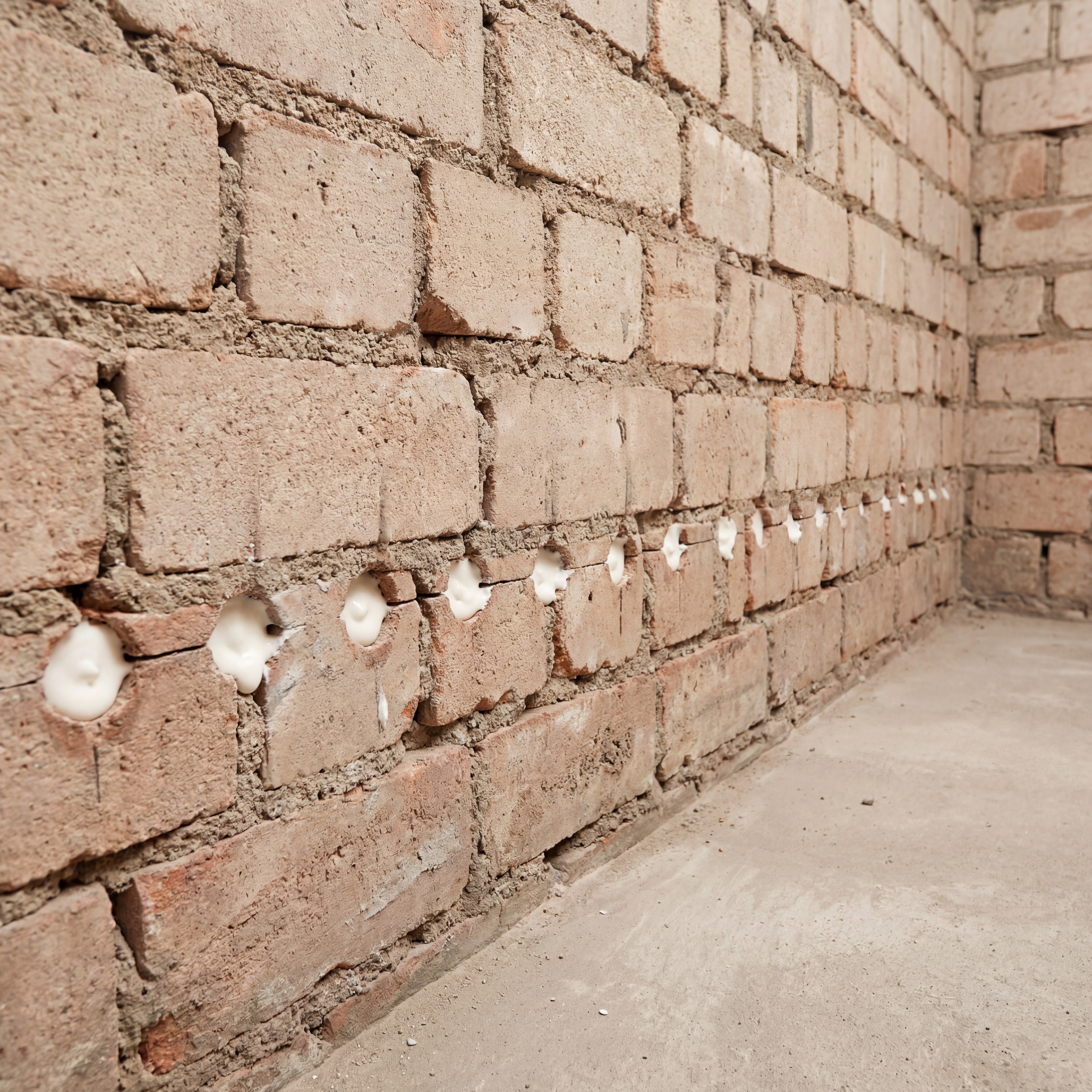 Op regelmatige afstand worden gaten geboord in de onderkant van de muur. Deze openingen vormen de basis voor het aanbrengen van de vochtbarriere.
